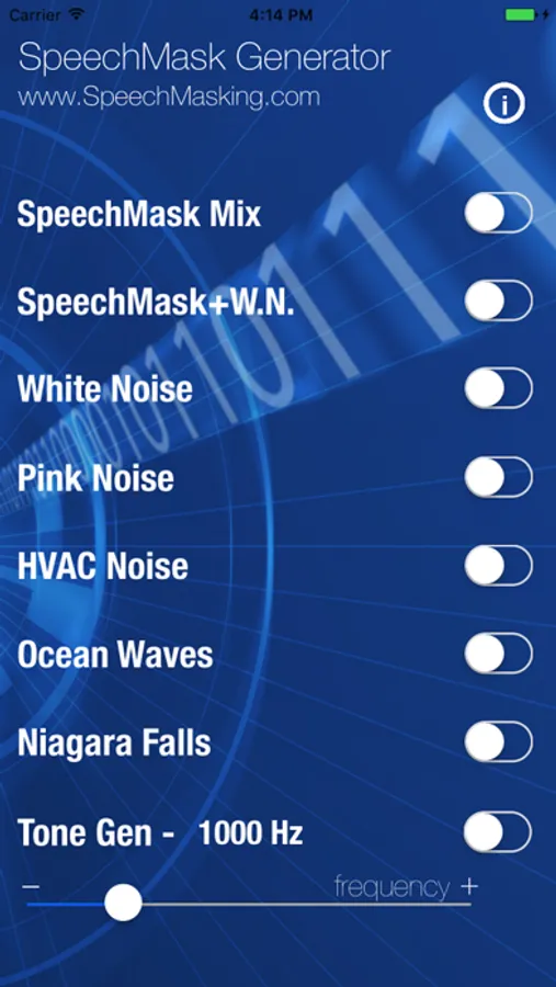 Voice-based noise generator used to illustrate the effects of speech masking to reduce intelligibility to the spoken word. This App also includes a basic, built-in Tone Generator.