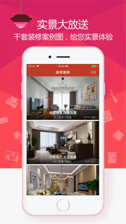 《装修案例》源源不断地推陈出新,让家居案例帮助用户刷新家的颜值。不管是户型、风格、空间匹配度,它都给你一个最佳的解决方案。不同造型的家具,粉刷刷不同色彩的漆面,添置不同款式的软品,这些装饰中常常遇到的大难题,在《装修案例》的世界里通通都是小CASE,只要是一位生活的有心人,空间便会成为你的另一个颜值担当。