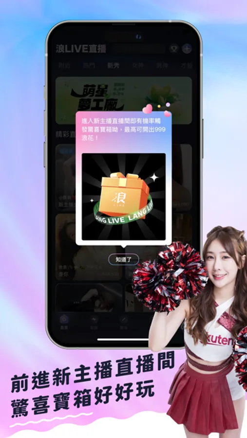 進入新主播直播間,有機會掉落隨機寶箱,最高可獲得 999 浪花,一起發掘明日之星!