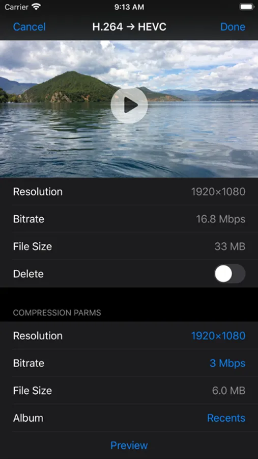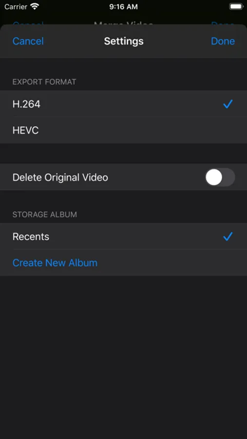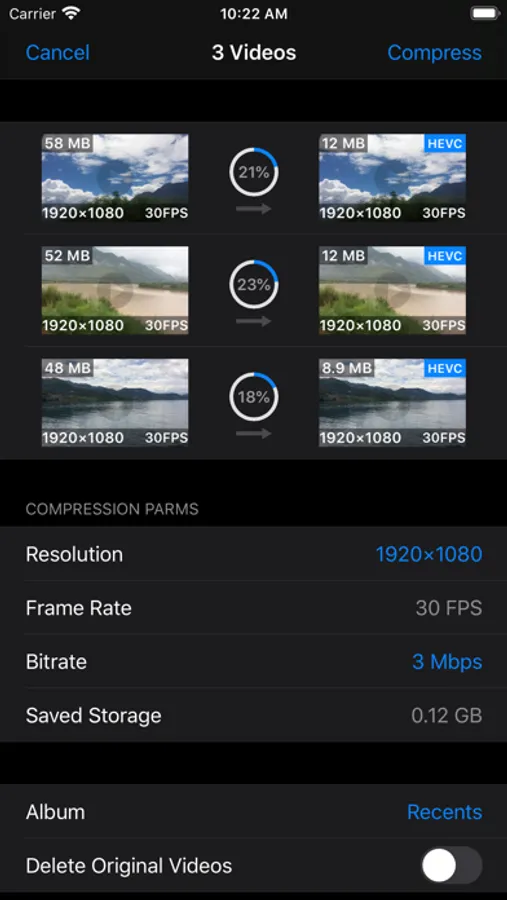 - Compressed video can be saved to a user selected album