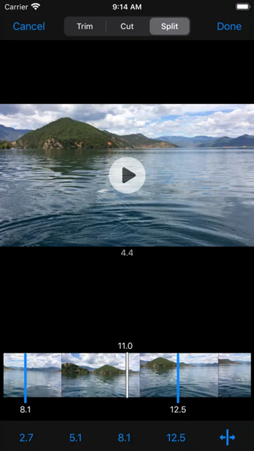 - One video can be split up to 5 to 7 clips, export and save to Photo Library