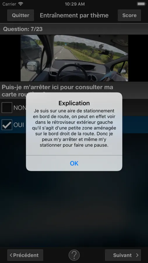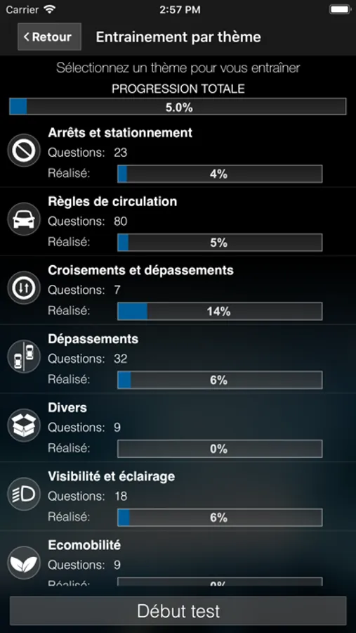 Pratiquez un test dans les mêmes conditions que la partie théorique de l'examen officiel du permis de conduire. Quand vous aurez fini le test, votre score s'affichera et vous aurez la possibilité de revoir toutes les questions ainsi que les explications complètes pour chaque question afin de faciliter l'assimilation de la règle à prendre en compte; cela vous permettra de répondre correctement à des questions similaires les fois suivantes.