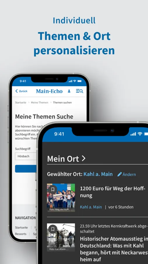 Die Main-Echo App ermöglicht Ihnen, Nachrichten ganz nach Ihren Wünschen zusammenzustellen. Unter „Meine Themen“ können Sie auswählen, zu welchen Themen Sie aktiv informiert werden möchten. Unter „Mein Ort“ haben Sie die Möglichkeit Ihren Heimatort festzulegen, um alle Neuigkeiten aus Ihrem Ort im Zugriff zu haben. In Ihrer persönlichen Merkliste können Sie sich Artikel vormerken, welche Sie zu einem späteren Zeitpunkt lesen möchten. Alle genannten Funktionen können synchron am PC und auf Mobilgeräten verwendet werden.
