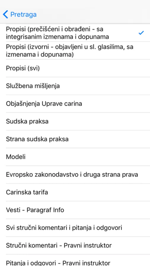 Osim dokumenata kojima je pristup besplatno dostupan aplikacija sadrži i službena mišljenja, primere sudske prakse, modele, obrasce, službena glasila, evropsko zakonodavstvo, Carinsku tarifu, objašnjenja Uprave carina, kao i tekstove i komentare stručnih časopisa koje objavljuje kompanija Paragraf.