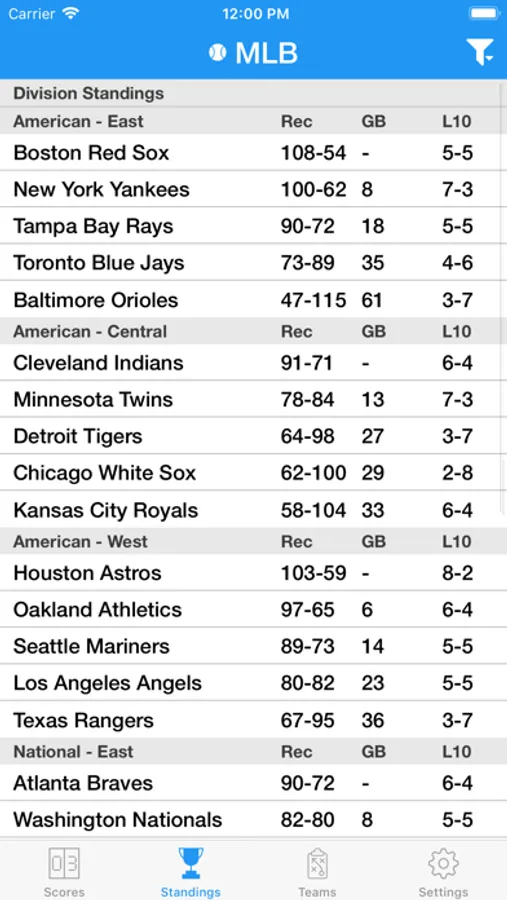 Carefully browse and follow the baseball scores and alerts on a beautiful and intuitive interface. The baseball box scores and standings are updated live.