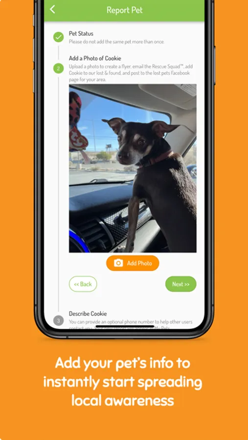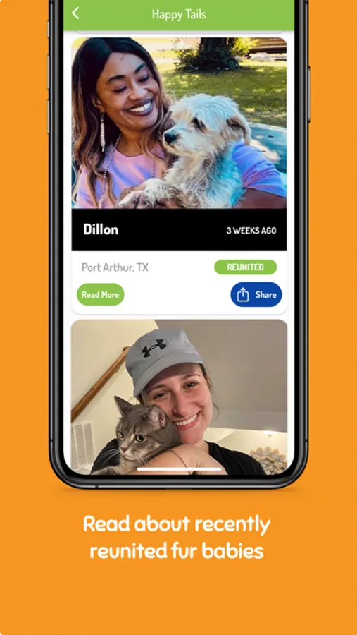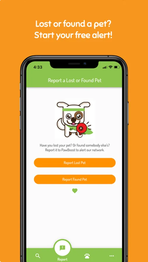 If you have LOST or FOUND a pet, you can report it by downloading the app, creating an account, then clicking the 'Report' button. Note: You will need a photo of your pet in order to complete the report.