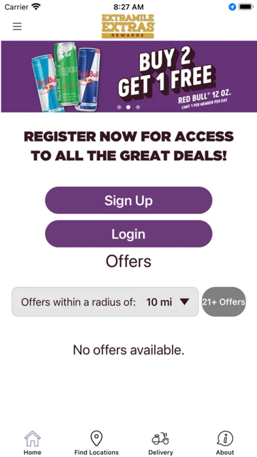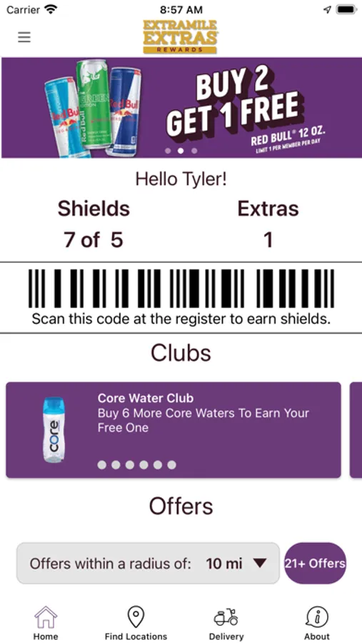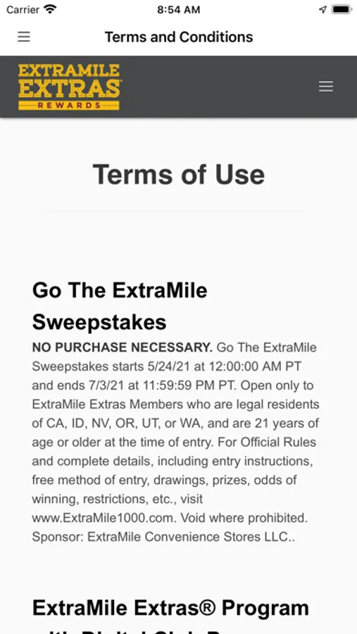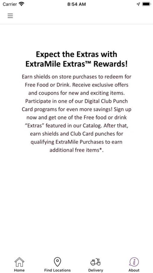 You can join and register for ExtraMile Extras reward program using this app, and keep track of your progress towards earning free Extras at ExtraMile. Make 5 qualifying purchases at any participating ExtraMile store to receive a free Extra.