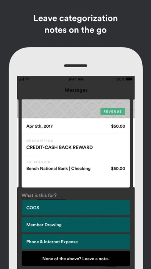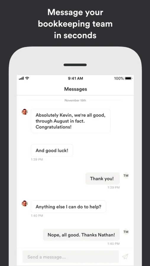 With Bench for iPhone, you can check in on your business performance in seconds with real-time cash flow updates and intuitive visual reports. Need to contact your bookkeeper? No sweat—chat with them in seconds via the message feed.