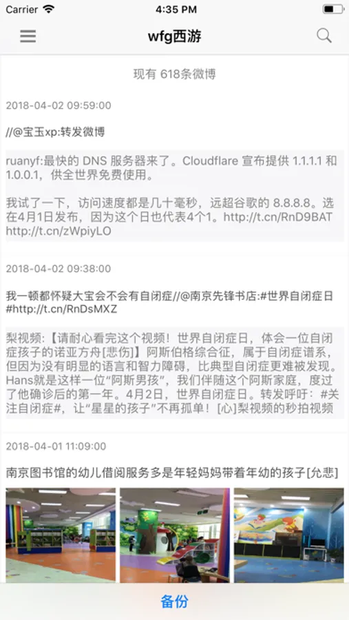 第一次使用时点击“备份”时需要登录微博。如果在点击登录时没有反应,可以到Safari中打开weibo.cn,测试一下是否能登录上微博官网。