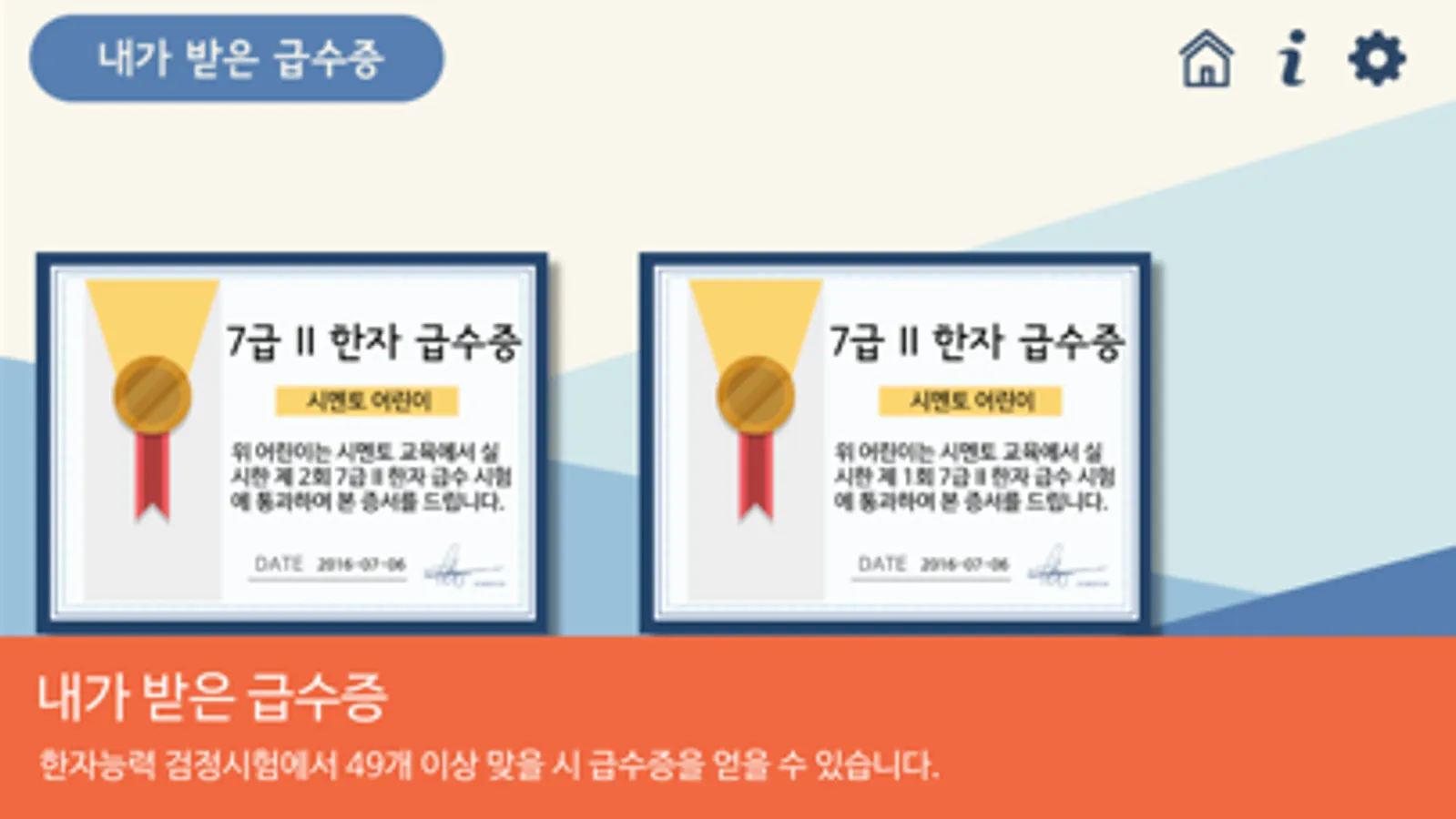 퍼즐, 한자 맞추기, 따라쓰기, 같은 한자 선택 등 재미있는 게임을 통한 한자 학습이 가능하며, 모의 시험을 제공하고 있습니다.