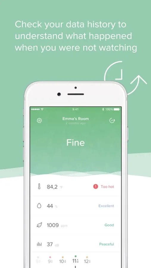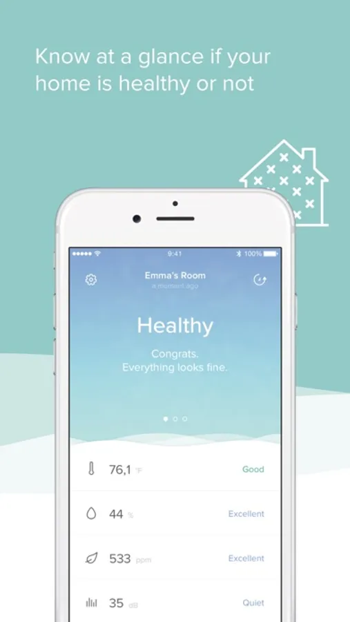 • The App‘s color-coded background makes it easy to see how healthy the room where you put your Healthy Home Coach is.