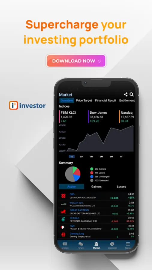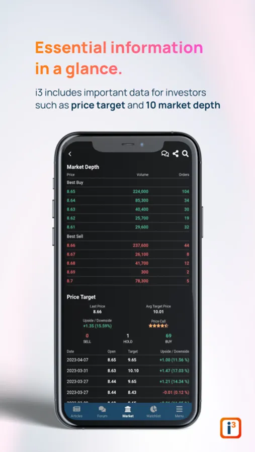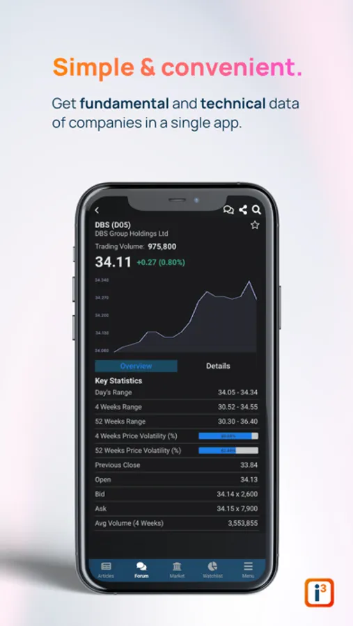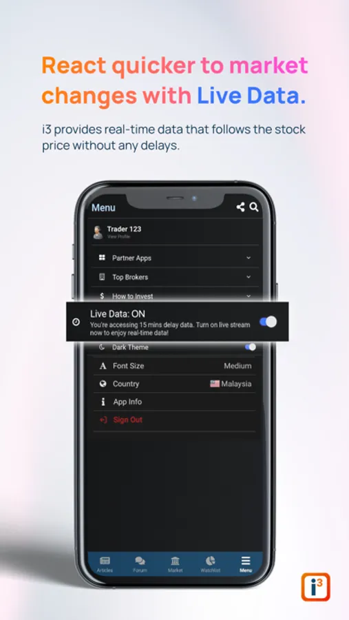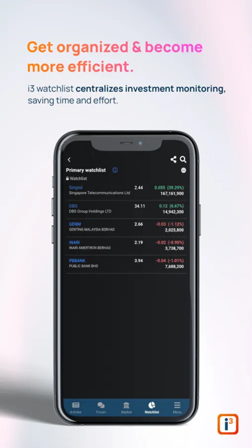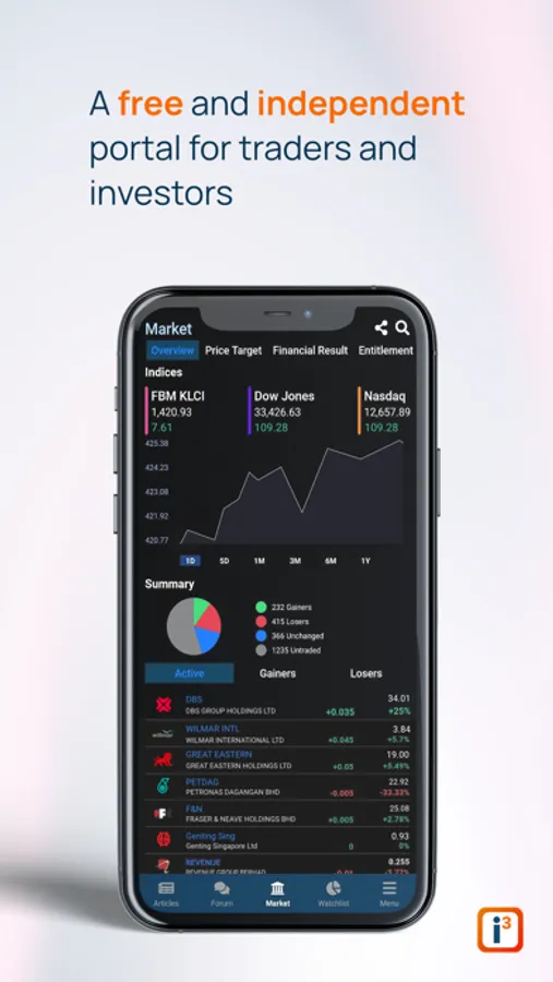 Drawing from the successful stock investment portal at I3investor.com, the I3investor App allows you to access many of the popular features of the I3investor.com portal from your smart mobile devices. This enables you to be an "independent, intelligent and informed investor" and stay on top of the market while you are on the go.