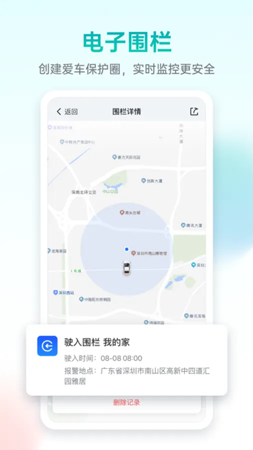 电子围栏:车辆进出围栏将触发警报发送给车主;