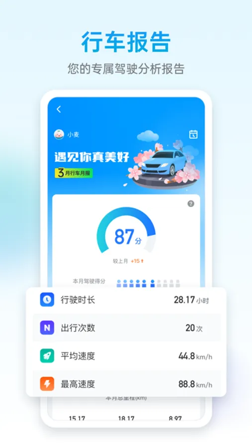 可以方便查看历史轨迹、行程记录、停车点,系统自动对驾驶行为进行分析,给出驾驶评分;生成每一笔行程的轨迹报告,多维度的图表统计,让您更了解您的驾驶行为。