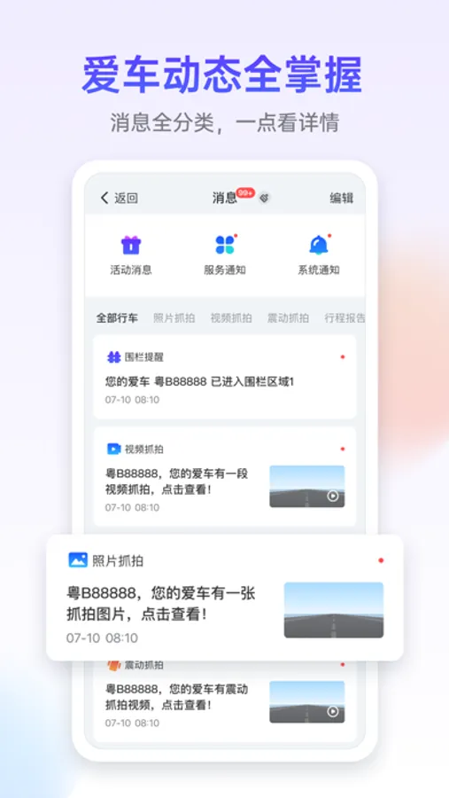 停车监控:离开爱车时,自行监视车身周围,有异常及时通知您;