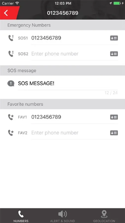 - Phone numbers: up to 2 SOS numbers with specific SOS message and up to 2 preferred numbers for one touch calls