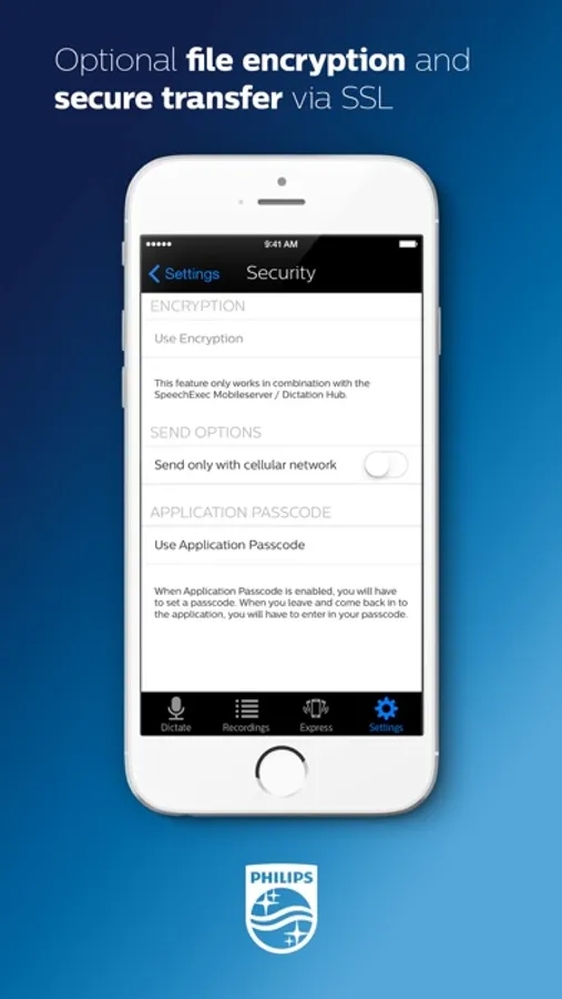 With Philips SpeechExec mobile server you can manage secure dictation file delivery. Once an audio file is transferred to Philips SpeechExec mobile server, it is sent automatically to the right transcription workstation within your company network. The mobile server license can be acquired at a Philips certified reseller. Find a reseller near you: www.dictation.philips.com/smartphone_buy