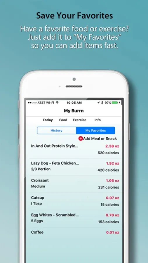 Have a favorite meal or exercise. Add them into the app for easy input the next time you eat or workout.