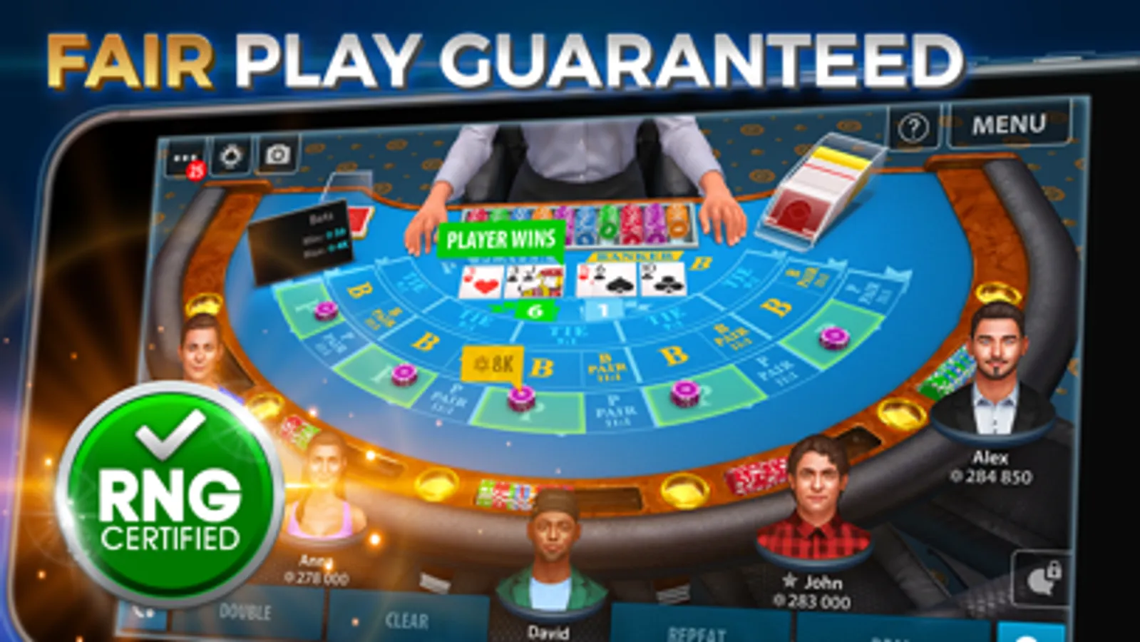 • FAIR PLAY GUARANTEED – Our certified Random Number Generator (RNG) gives you the best and fairest baccarat experience!