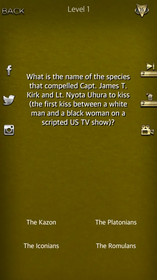 • Play with friends, and share the trivia fun! Are you stuck on a question? Need help with some trying trivia? You can share the question on Facebook and get help from your friends. Are your friends Trekkies? Challenge them to see who deserves the captain seat!