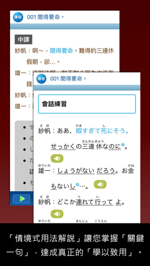 ● 會話可「逐句點選」播放,張大耳朵聽,訓練聽力語感。