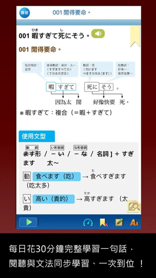 「花30分鐘完整學習一句話所隱含的規則性文法」,並掌握「適時、適地、適人」的使用時機,達成「深入、完整」的有效學習。