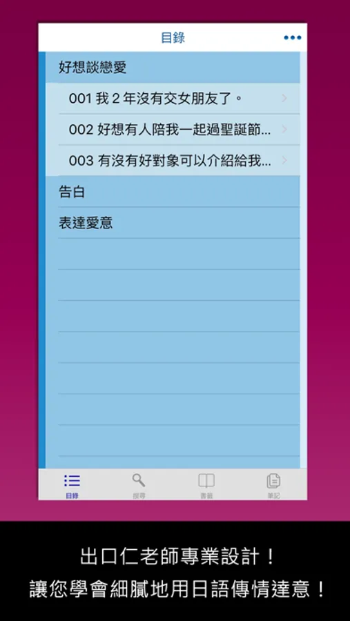 每一個主題句,都搭配一篇「戀愛日語會話」場面。道地的日式思維,彷彿實境體驗日劇情節,學習示愛、承諾、吵架、道歉、分手…等,性別差異的日語應答方式。