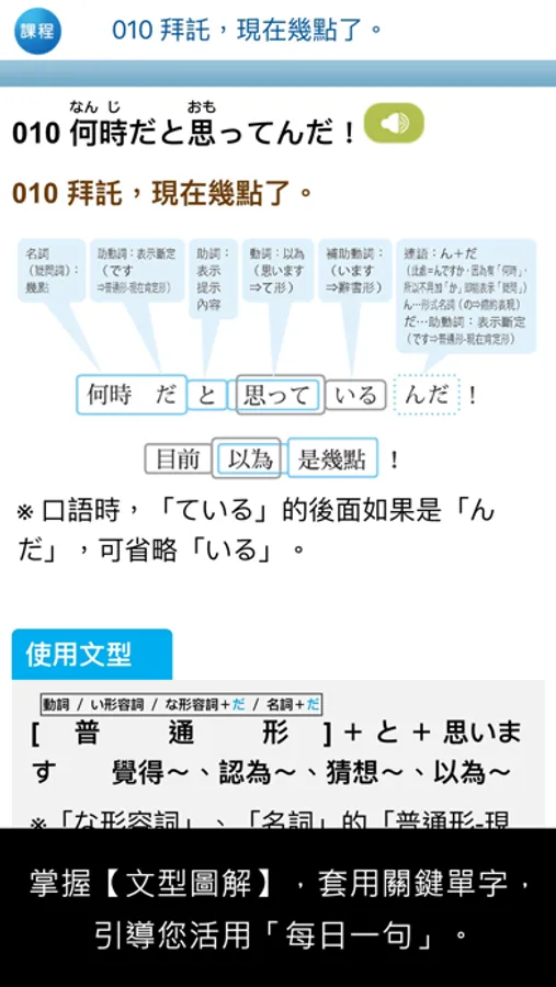 詳述這句話「什麼時候說?」「可以對誰說?」以及「從中文句義看不出來的用法線索」、「提醒建議」等,不僅更容易熟記這個句子,學習會話也更具臨場感!
