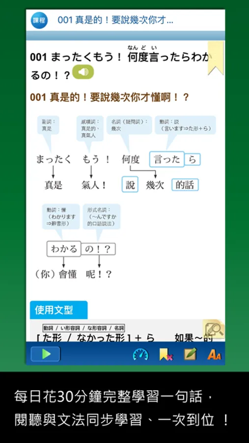 希望每日「花30分鐘完整學習一句話所隱含的規則性文法」,並掌握「適時、適地、適人」的使用時機,達成「深入、完整」的有效學習。