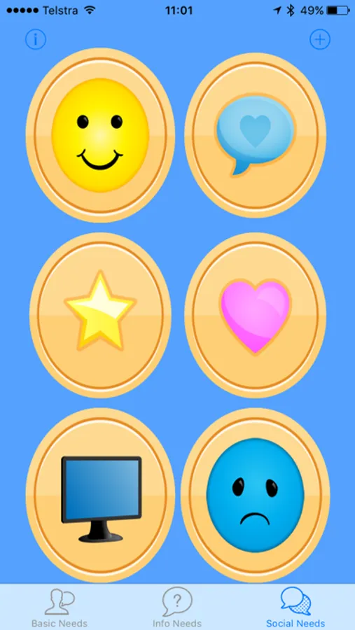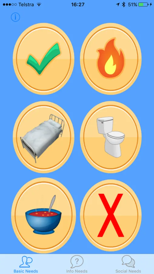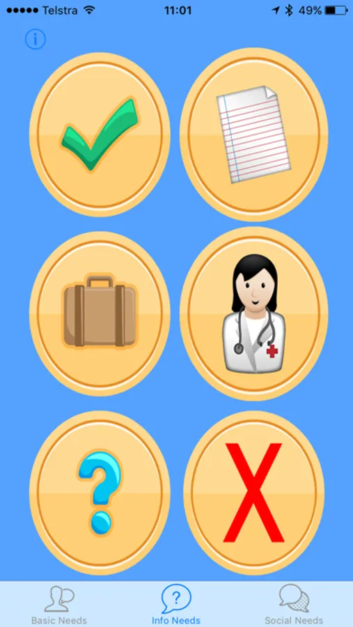 Hospital Talk has large buttons with pictures on three pages that have pre-recorded messages about care in hospital. Pre-recorded statements are provided with both female and male voices. The three talking pages enable people to communicate: basic care needs (Basic Needs), information needs (Info Needs), and social closeness (Social Needs). The Basic Needs page helps people to convey “yes” “no" "hunger or thirst” “comfort” “pain" and “bathroom”. The Info Needs page enables people to ask questions about care, test results, going home, and seeing the doctor. The Social Needs page is good for having a chat, talking about feelings, and asking to talk to a caregiver. For example, using Hospital Talk, a patient can say “yes”, “no”, “what are my test results?” “I need some more information” “thank you” “how’s your day?” or “I’m feeling a bit stressed.”