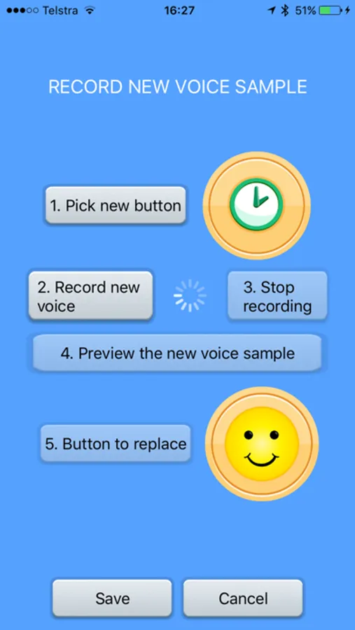 You can also use the Hospital Talk app to record your own or another person’s voice for your own messages. You then attach these to the buttons on the Social Needs page. These personal or custom-made messages can be updated as often as needed and only take a few seconds to record and save. If the user wants to return to the synthesised speech male or female voices, the app resets to the default pictures and pre-set messages on the Social Needs.