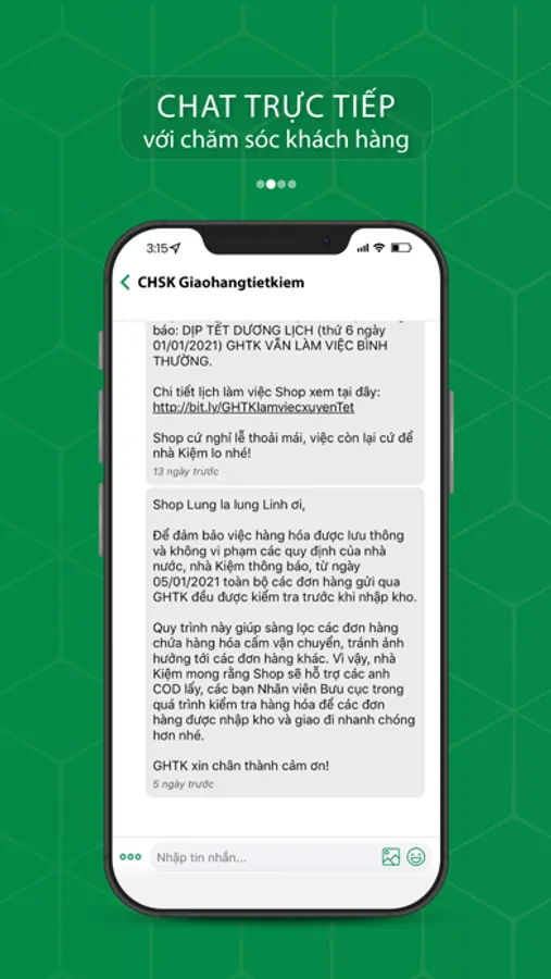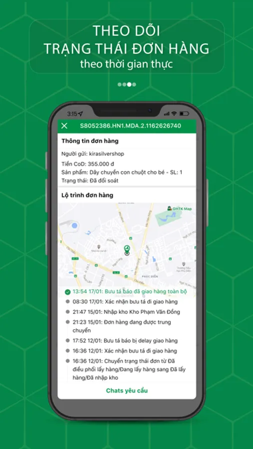 • Với app GHTK, Shop bán hàng online gửi yêu cầu thẳng cho vận hành GHTK để được hỗ trợ nhanh chóng. Mọi phát sinh trong quá trình giao hàng sẽ được thông báo tức thời cho Shop qua ứng dụng.