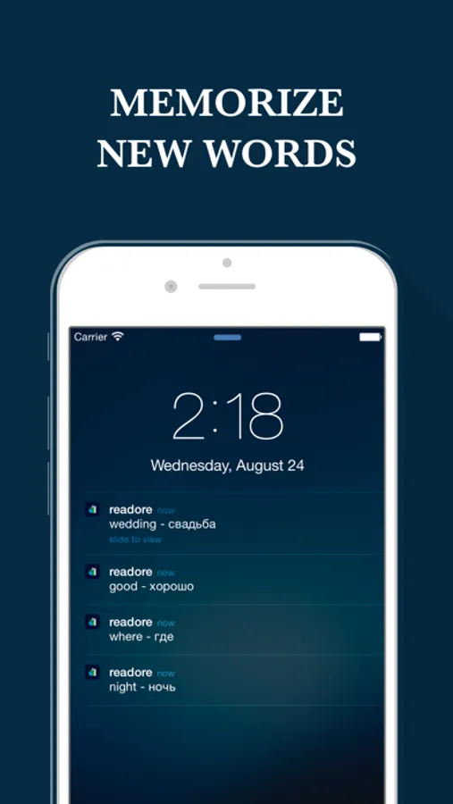 App sends you push-notifications with unknown words you met in the book. 10 new words a day is 70 new words a week, 300 words a month, 3650 new words a year. While native speaker use only 3000 of them in his everyday life.