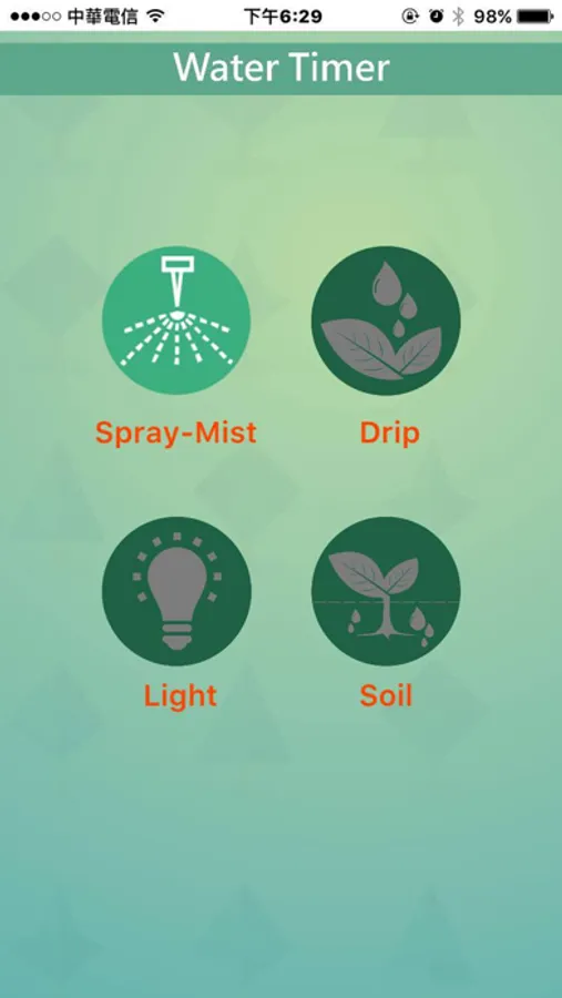 此APP应用需要和专用控制设备配合使用,应用内容为定时灌溉控制,通过蓝牙4.0控制设备的喷灌或喷雾动作,喷灌模式可实现一天二个时刻灌溉,间隔形式可以星期方式或隔天方式;喷雾形式可设置一天中选取二个时间范围工作。