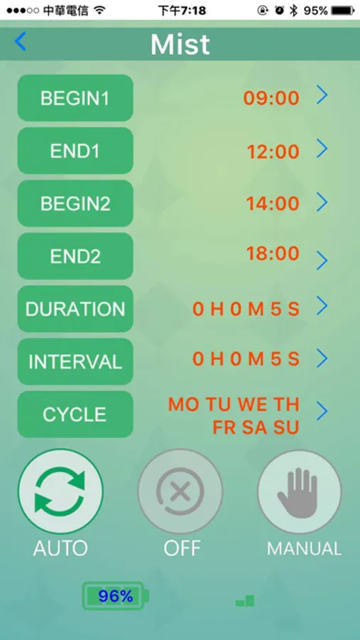 Bluetooth modules using firmware 4.0 or above are connectable with this application. It offers spray watering programs or mist watering programs. The spray watering program allows 2 specified start watering time per day, while the frequency can be set by days of the week, or how many days. The mist watering program allows 2 time period per day to run the watering cycles.