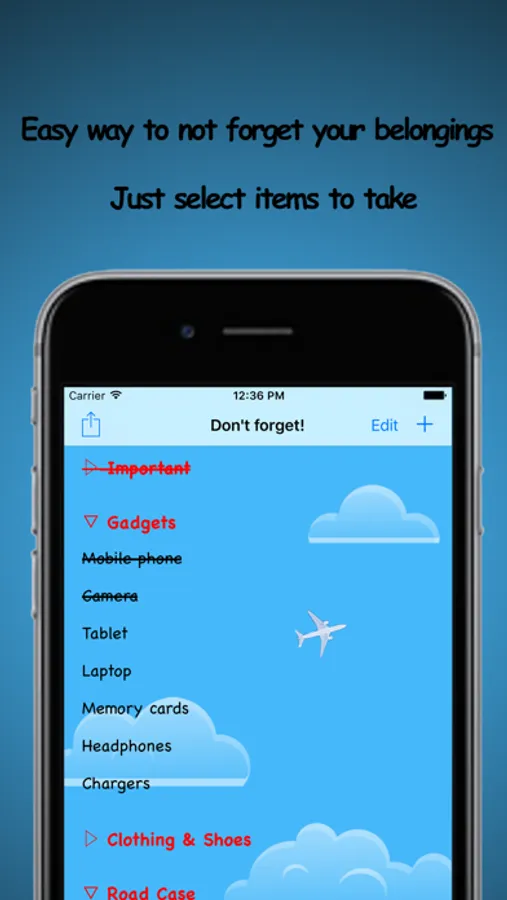 Have you ever faced with situation when you're leaving for vacation or a business trip and suddenly find out that you have forgotten something important at home? You can forget about this problem with this app. Just create your own checklist (or use default one) and that's it.