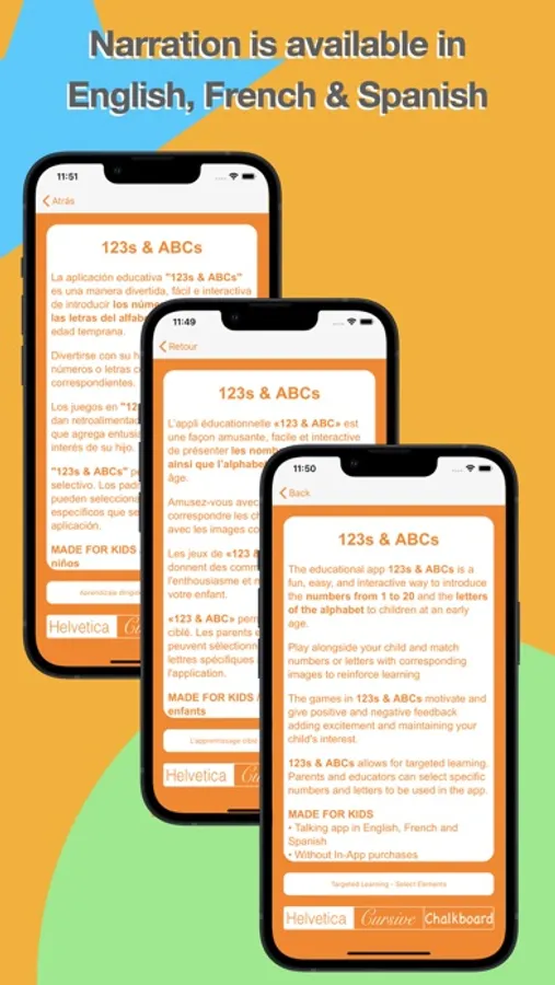 The games in “123s & ABCs” motivate and give positive and negative feedback adding excitement and maintaining your child's interest. Fun, cute stars appear in the game modes displaying different emotions depending on the answer.