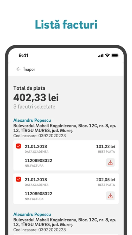 • Vizualizezi și descarci facturile emise și istoricul lor