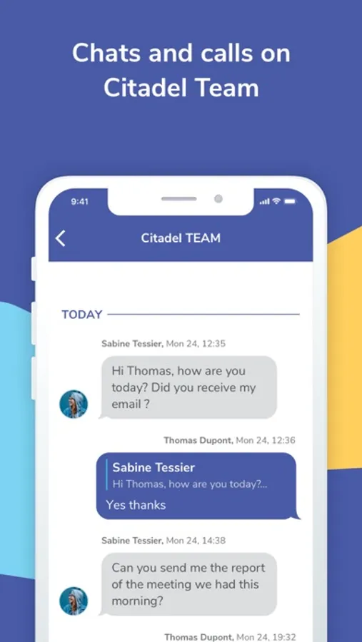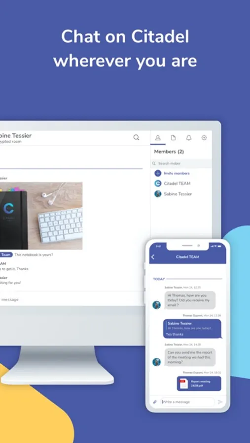 With Citadel Team, organize audio and video conferences, start calls, send messages, create groups with all your colleagues, share all kind of documents, videos and high-quality photos with complete confidentiality.