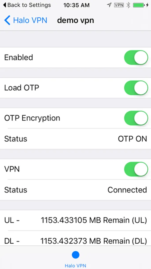 The Halo-VPN™ client secures communications to a Halo-VPN™ server using proven certificate based SSL VPN standards and one time pads. The HPN (Halo-VPN solution) uses a proven and FIPS 140-2 standards based approach while providing the option of One-time pad implementation for ultra secure deployments. An SSL connection is established between the Halo-VPN client and the Halo-VPN server. Additional encryption is then enforced atop this SSL connection using one time pads which are pre generated and loaded into the phones (using iTunes)