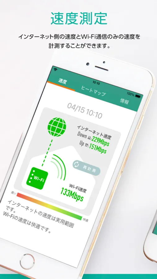 現在接続されているインターネットの速度、Wi-Fiの速度を数値やヒートマップで“見える化”することで、より快適なWi-Fi環境を実現するお手伝いをします。