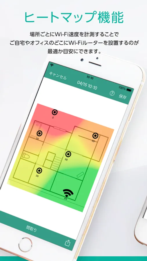 場所ごとにWi-Fi速度を計測することで、ご自宅やオフィス全体のWi-Fiの速度をわかりやすく把握できるヒートマップを作成できます。