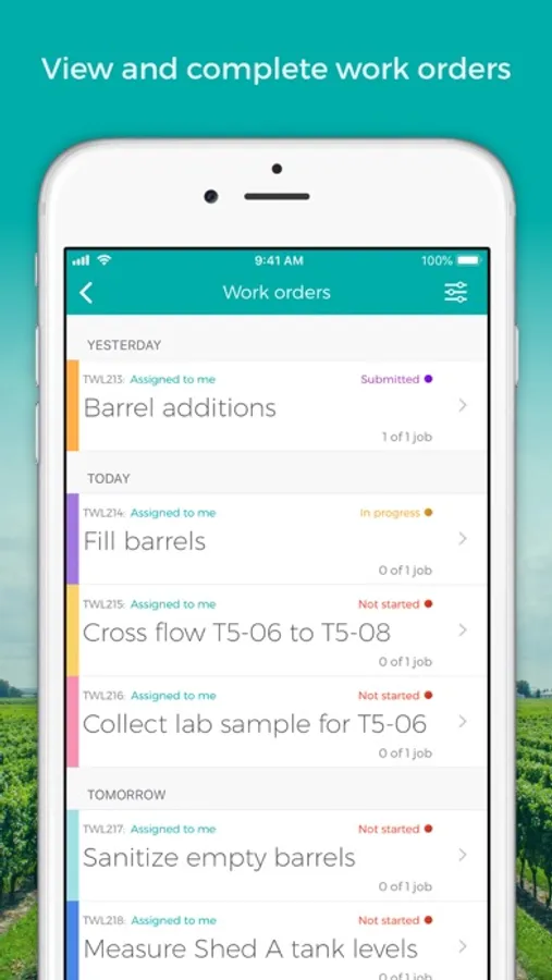 - view and submit work orders (transfer, topping, blend, additions etc)