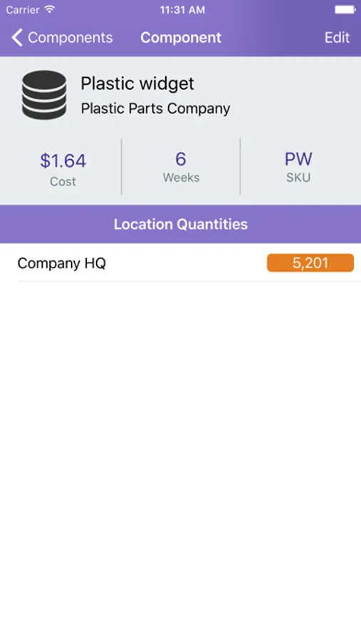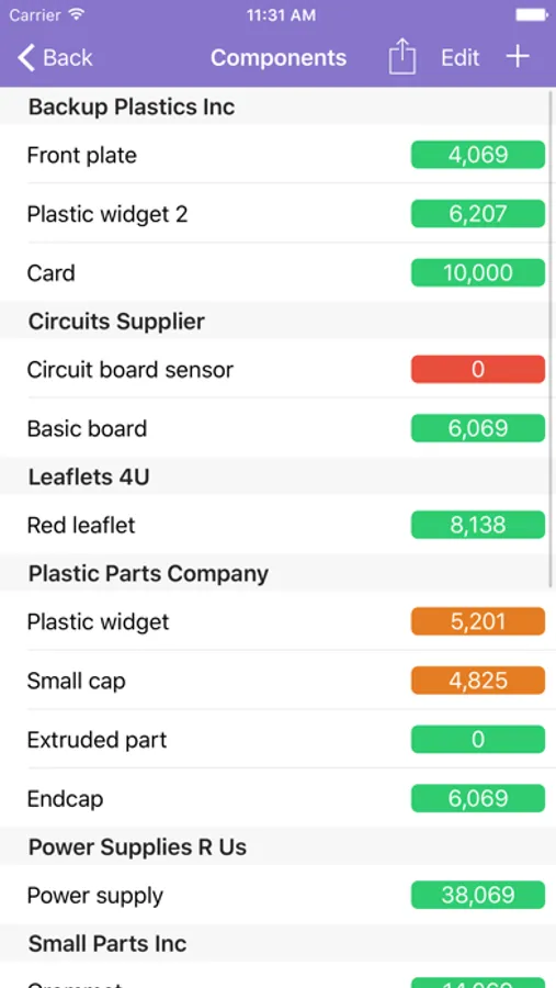- All your components stored, multi location stock levels, smart quantity warnings based on lead time and manufacturing rate. Exportable for quick stock take.