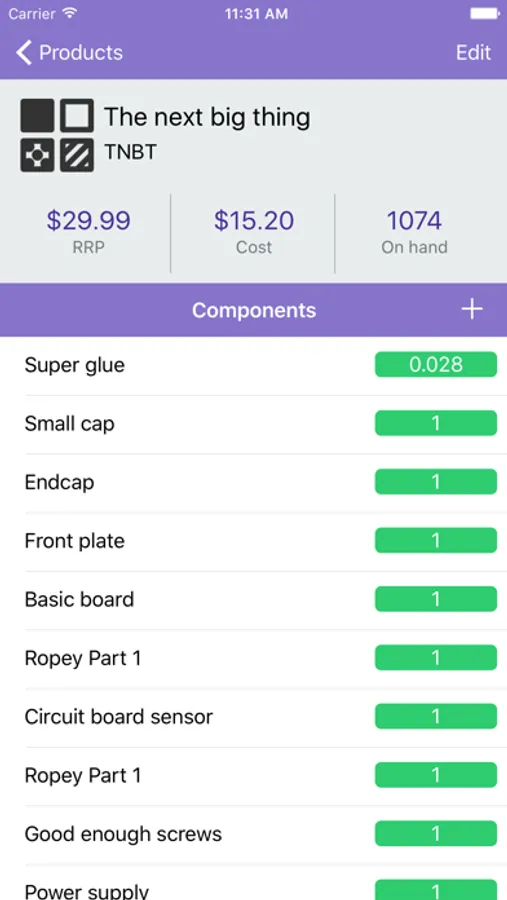 - Each product listed, editable sub components, smart stock warnings based on dispatch rate.