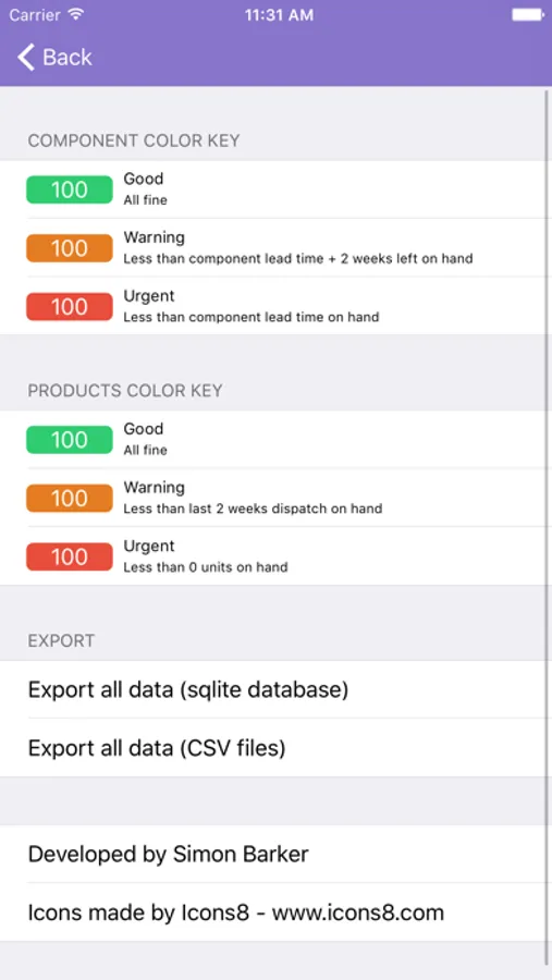 All of the data you put into Stock Controller is exportable to either CSV spreadsheets (Excel) or an SQLite database. We don't trap your data so time spent setting up your products and components is never wasted! This is also useful for monthly stock takes and sharing a snap shot of your operation with investors and stake holders.