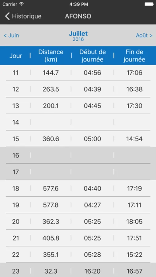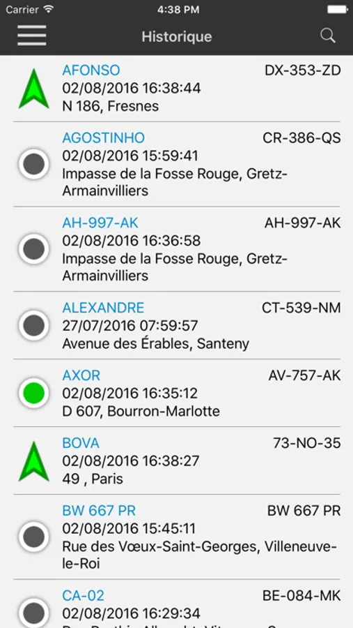 Consultez l'historique des trajets des véhicules en affichant la vitesse, les différents arrêts effectués, le kilométrage parcouru, les heures de début et de fin de journée.