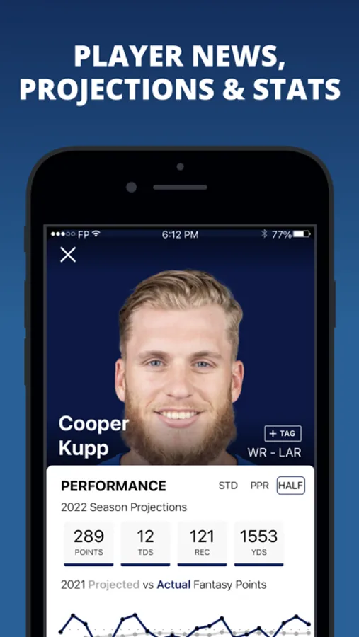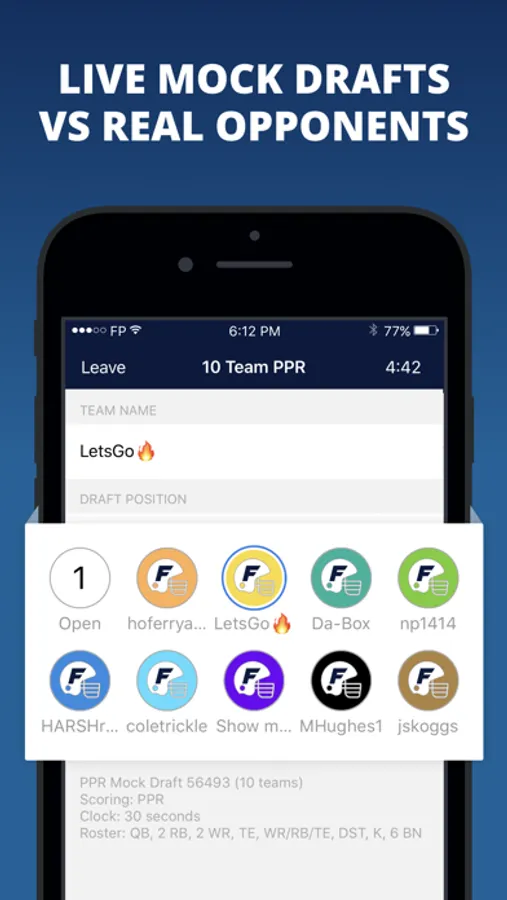 Configure your own league settings and define number of teams, players, and positions. You can also choose your scoring system (Standard, PPR, or Half PPR) or use our web version for custom scoring.