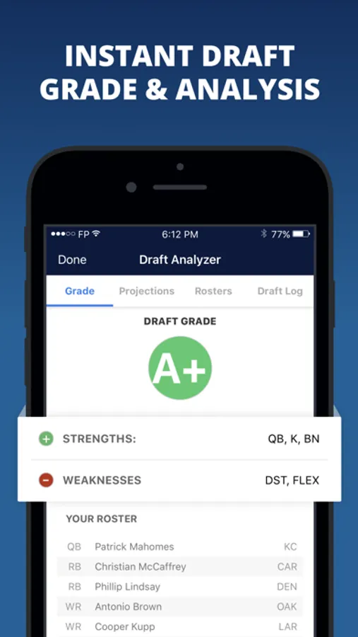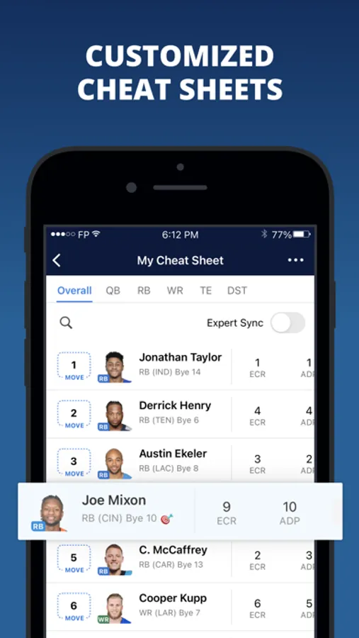 Sync with your live draft to get expert advice on who to pick for each round, while your draft unfolds in real-time. Drafted players will be automatically tracked for you.