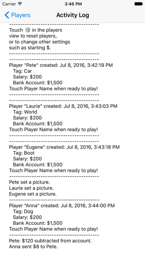 Add and manage players with the familiar iOS interface, and all of the information is saved when you leave the app - enabling easy breaks in the gameplay. A "Mode" setting automatically matches the starting bank account value of the most popular games. An Activity Log keeps track of every transaction, and when you are ready to start a new game use “Reset Players” in settings to reset all players back to the starting bank account value.